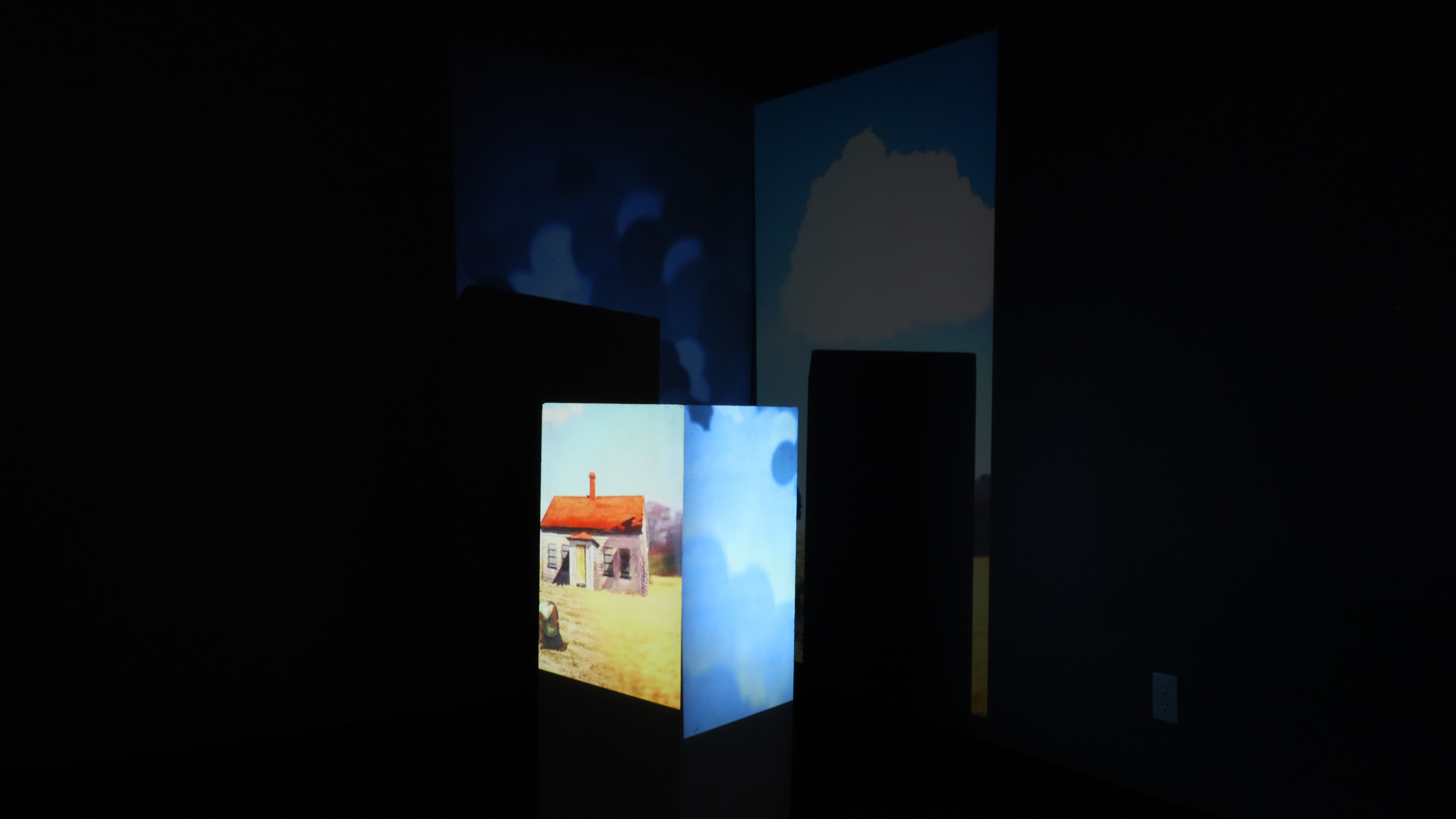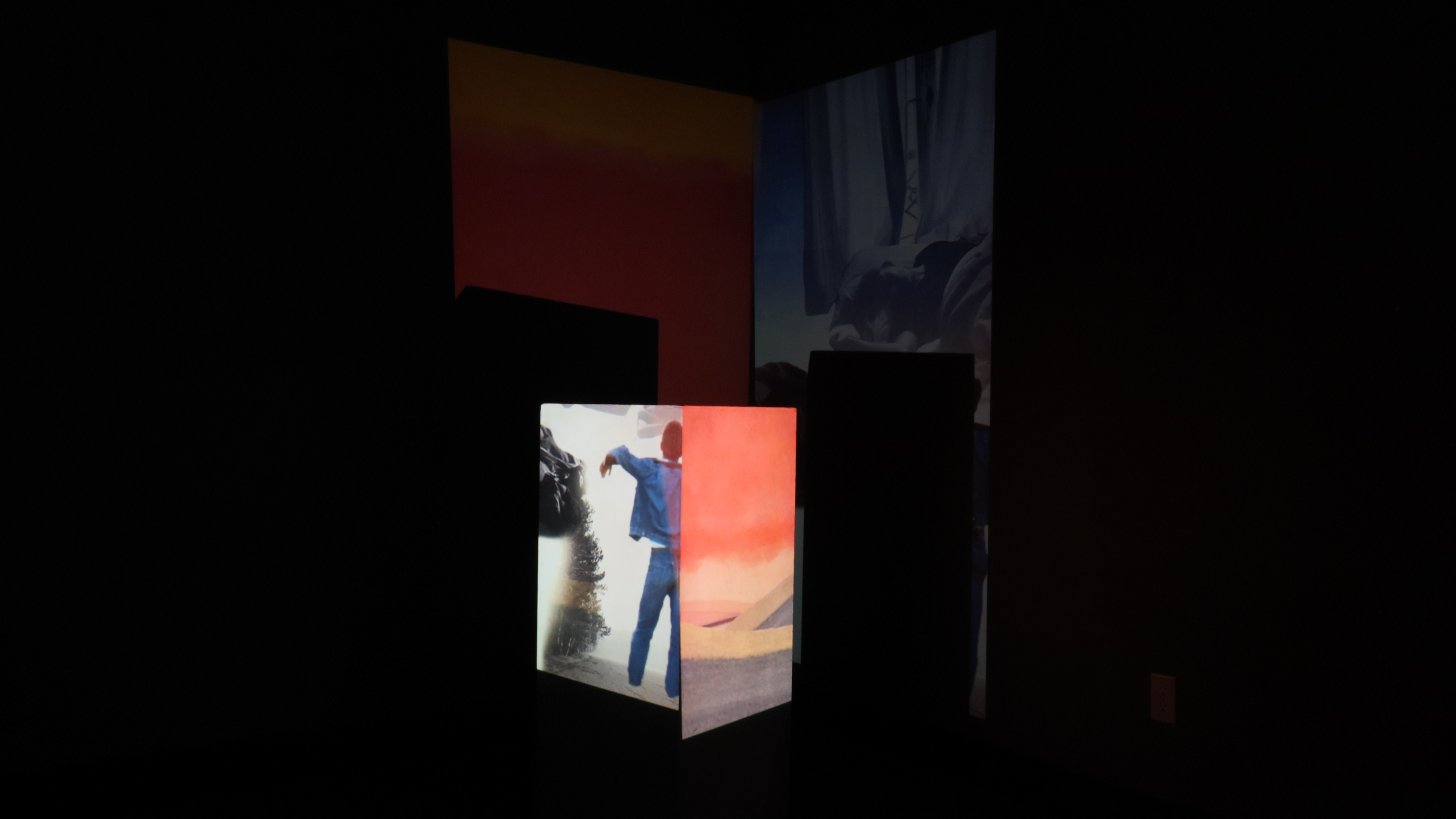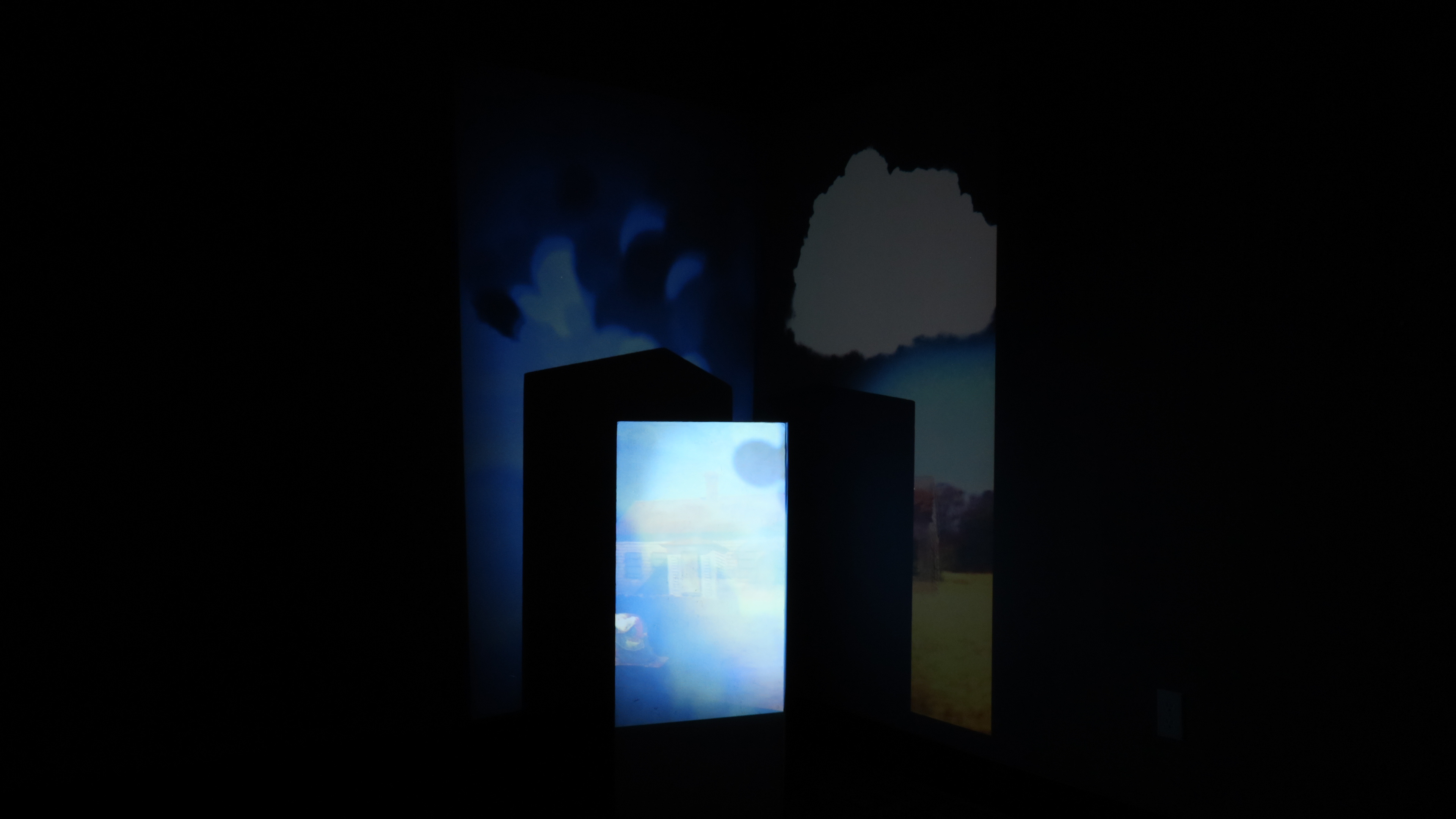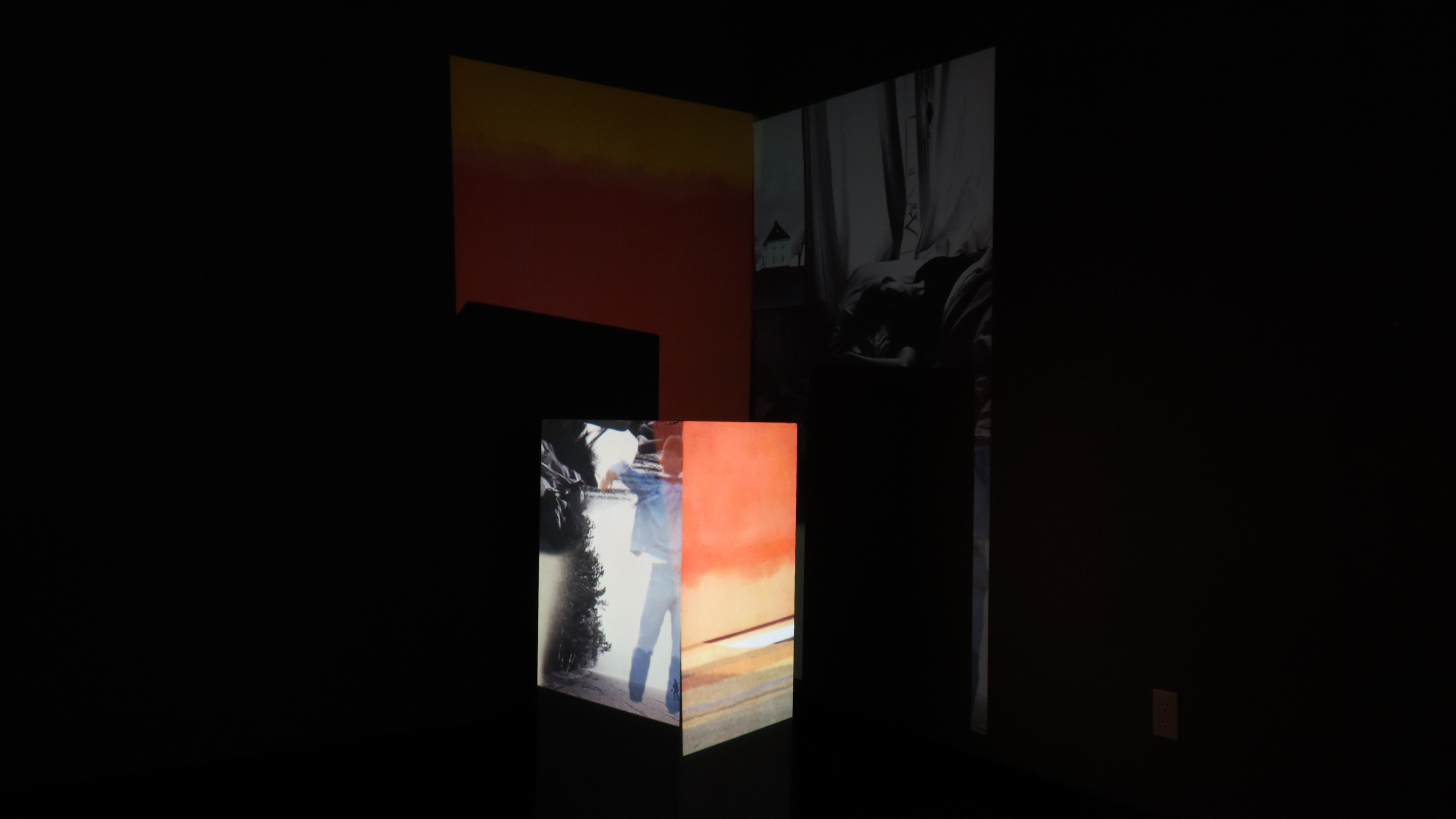 An experiment in iterative, collaborative conversation. This version runs roughly 20x faster than the original installation. The installation was set up in a corner with Jonah's motion collage (on the right) and mine (on the left) projected from two projectors simultaneously. A wooden block, painted white, was set in the path of each projector, first oriented orthogonally with the room—cutting out a piece of each projection—and later rotated 45° in order to catch part of each projector's throw and combine them.