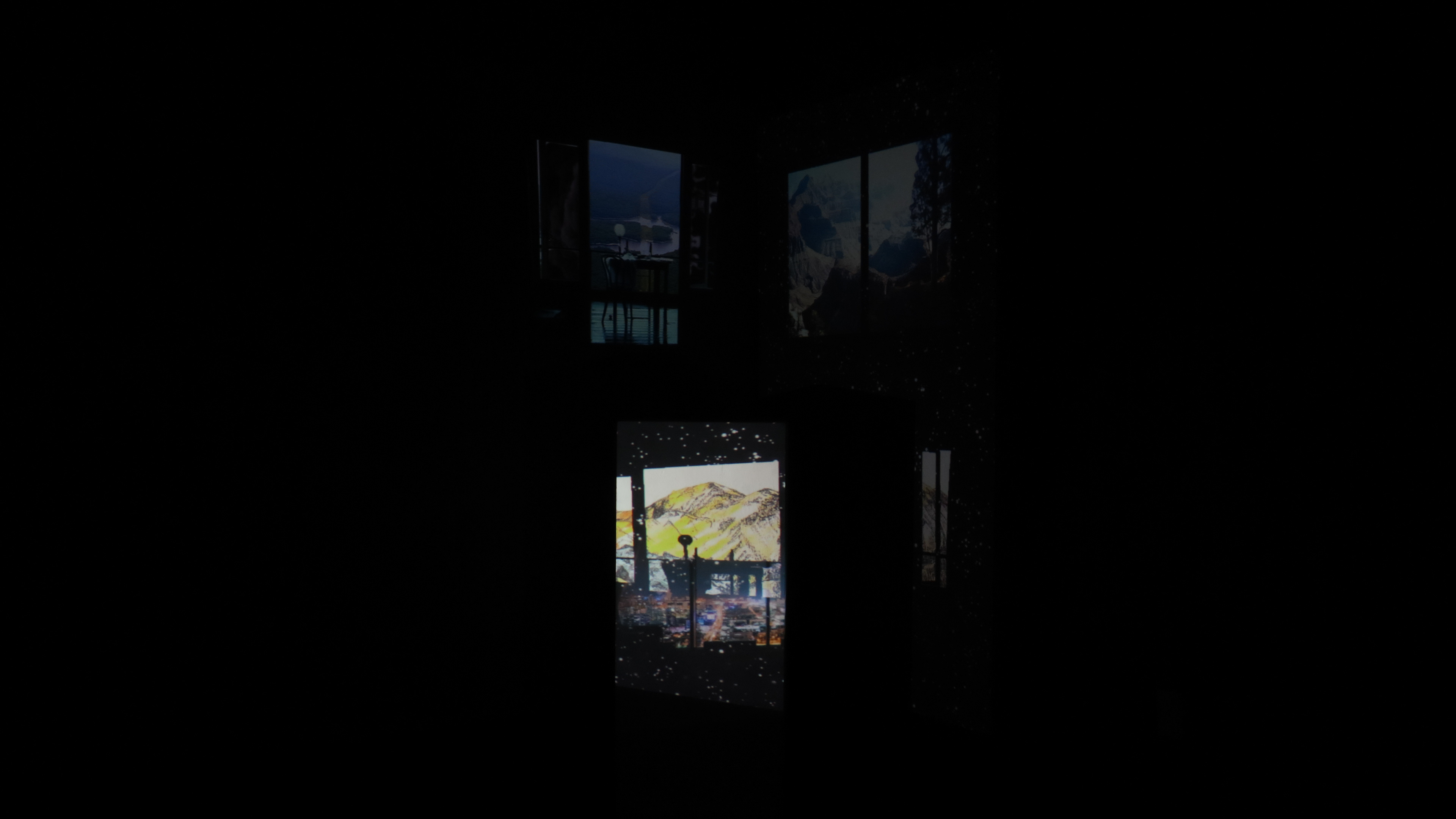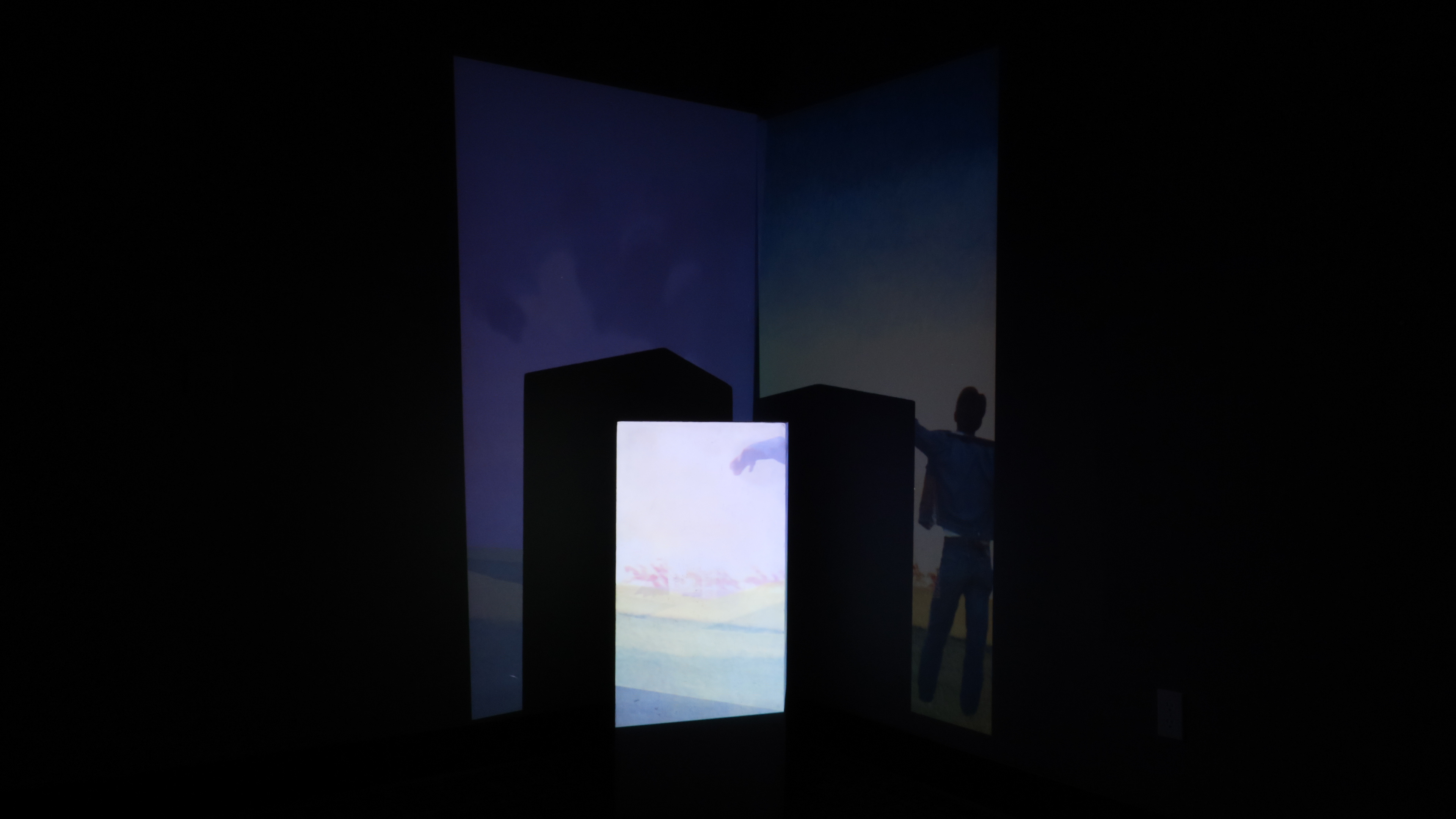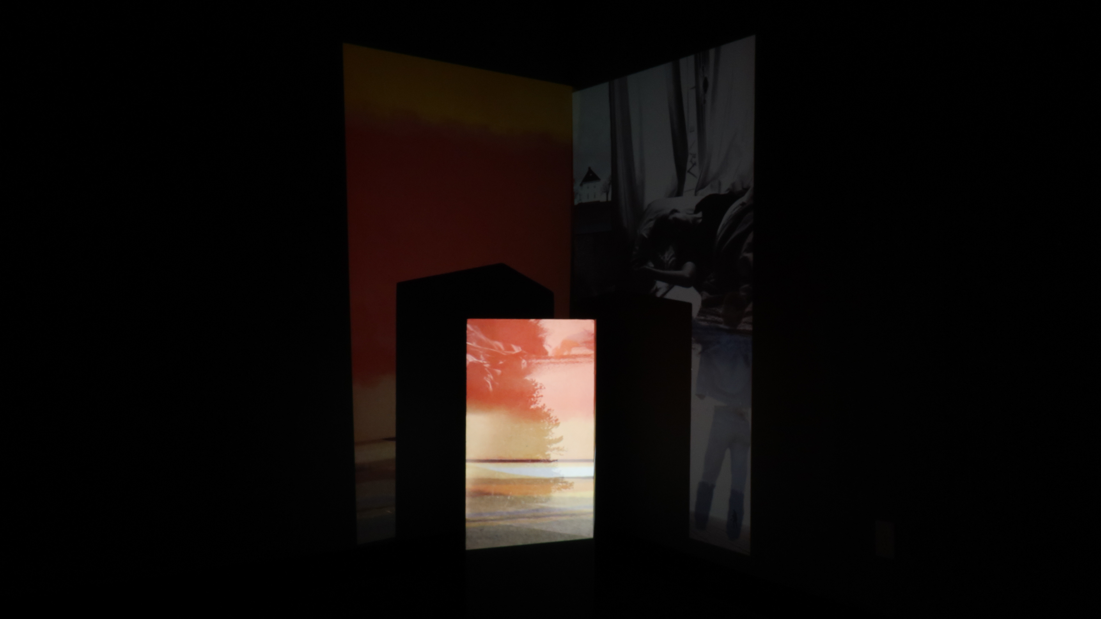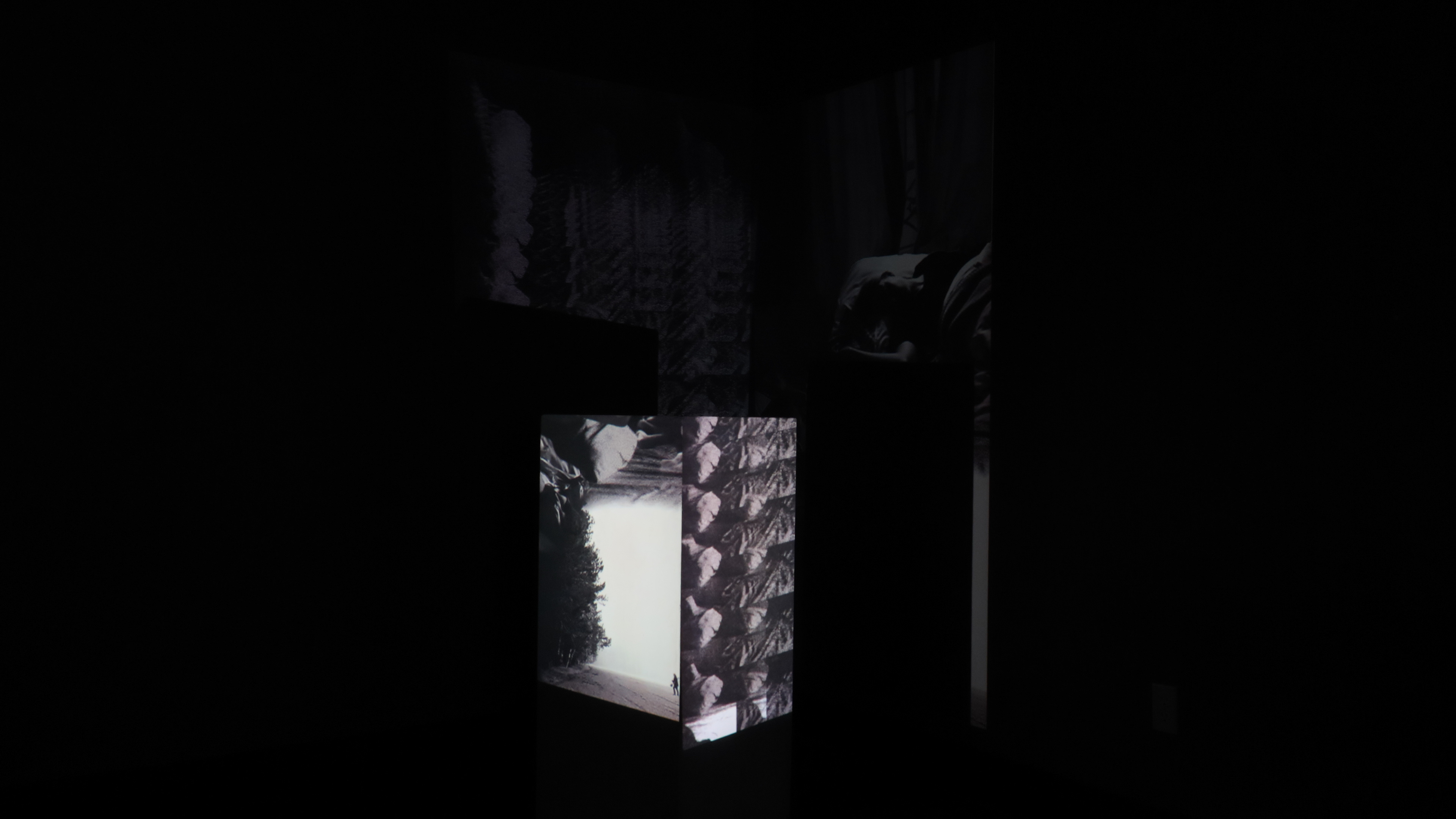 An experiment in iterative, collaborative conversation. This version runs roughly 20x faster than the original installation. The installation was set up in a corner with Jonah's motion collage (on the right) and mine (on the left) projected from two projectors simultaneously. A wooden block, painted white, was set in the path of each projector, first oriented orthogonally with the room—cutting out a piece of each projection—and later rotated 45° in order to catch part of each projector's throw and combine them.